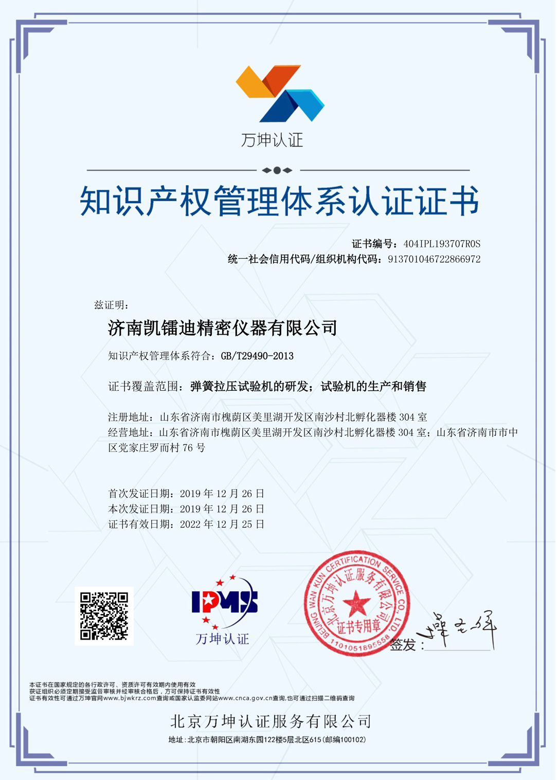 知識産權管理體系認證證書 - 濟南凱鐳迪彈簧有限🧑🏻‍❤️‍🧑🏼公司