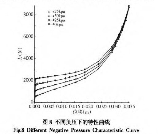 采用圖5的BT-NPI計算模型,分析負壓腔室壓強大小時負壓空氣隔振器特性的影響。在初始工作行程為7s~的前提下,采用預加載的方式分别設置腔室初始🥑️内💑🏾壓為OkPa,25kPa,50kPa,75kPa,得到不同負壓狀态下的特1生曲線,如圖8所示。從圖8的計算結果可以得出,不同初始腔室壓強下的特性曲🙈線均👩🏿❤️💋👨🏽具有明顯的非線性。負壓值越大,剛度越低,當接近真空狀态時,剛度接近零。初始腔室壓強越小承載力越大。理論分析表明,當腔室内壓強為0時,剛度接近零,說明在額定載荷行程下,負壓腔室承載👩🏽🐰👩🏿主👿要載荷,橡膠囊發生彎曲變形,基本不承受載荷👽。在沖擊.區間則為橡膠和簾線的彎曲和拉伸變形承擔主要載🏃🏻♀️荷。當腔室壓強逐漸增大時,剛度也增大,說明橡膠、簾線和負壓腔室聯合承受載荷,剛度增大。綜上說明,負壓空氣隔振器可以獲得準零剛度特性,同時具有一定的抗沖擊能力。